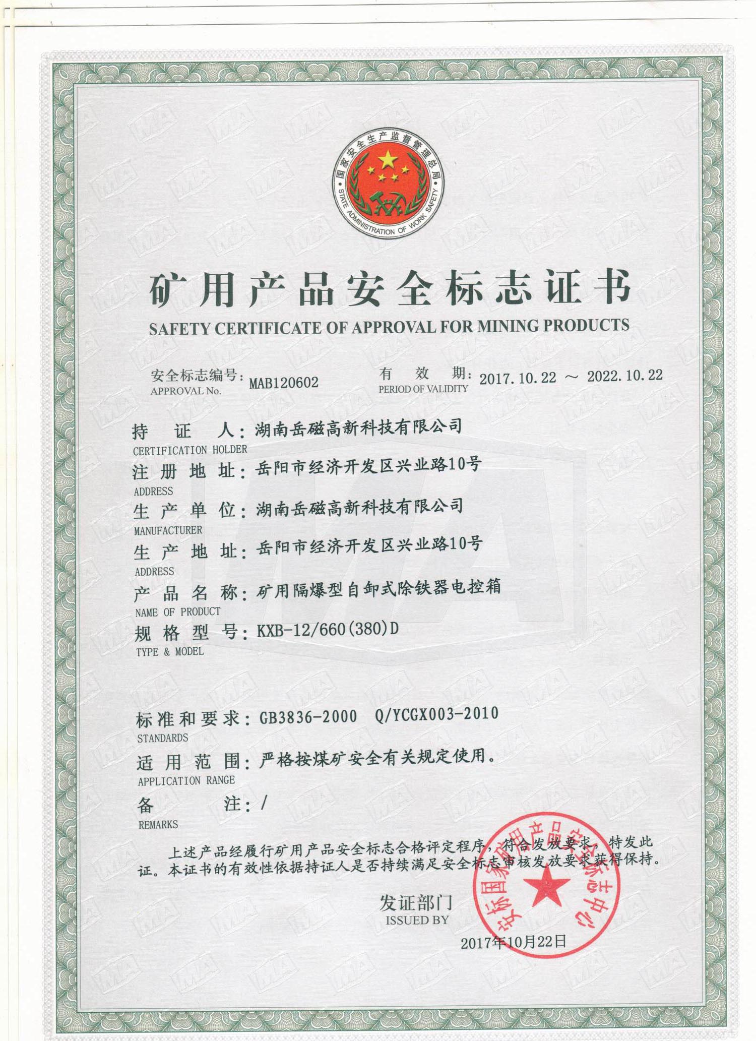 礦用產(chǎn)品安全標(biāo)志證書